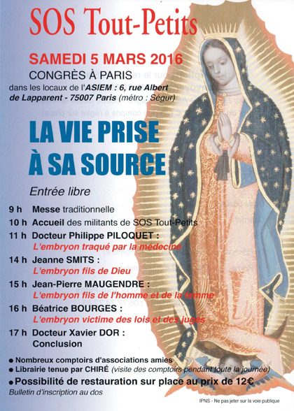 Congrès de SOS Tout-Petits, sur le thème : « La vie prise à sa source », dans les locaux de l’ASIEM (6 rue Albert de Lapparent, 75007 Paris, métro « Ségur ») à partir de 9h (messe traditionnelle).